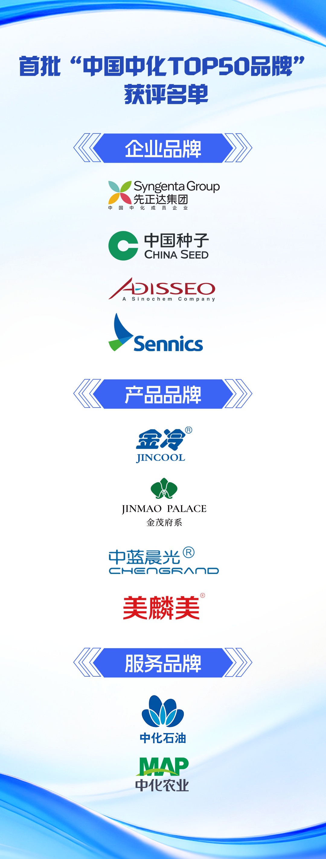 发布会现场揭晓中国中化品牌引领行动优秀成果暨首批10个“中国中化TOP50品牌”获评名单: